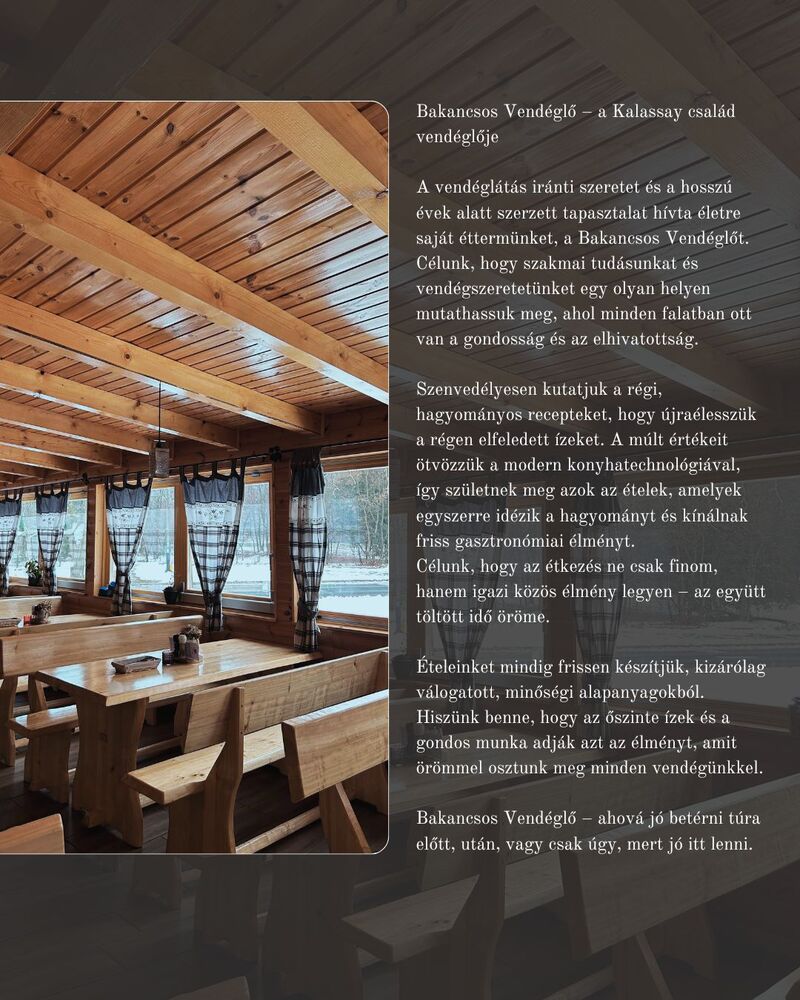 A vendéglátás iránti szeretet és a hosszú évek alatt szerzett tapasztalat hívta életre saját éttermünket, a Bakancsos Vendéglőt. Célunk, hogy szakmai tudásunkat és vendégszeretetünket egy olyan helyen mutathassuk meg, ahol minden falatban ott van a gondosság és az elhivatottság.